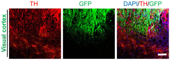 Our in vitro experiment and previous animal studies have shown that transplanted NSCs can differentiate into specific neurons, including DA neurons (Figure 2A,B). Therefore, the distribution of DA fibers in the visual cortex was analyzed by staining for TH. The results showed that GFP+ cells partially differentiated into DA neurons, and fibers extending from host tissue could be observed in the graft (Figure 8). There was no clear boundary between GFP+/TH+ cells and GFP−/TH+ cells. This result indicated widespread differentiation of transplanted NSCs not only into mature neurons but also into special types of neurons. The details of above antibodies used in results showed in Tables S1 and S2.