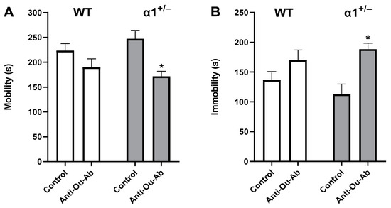The behavior of C57Bl/6 wt and α1+/− mice was first examined in the FST, a model of depression-like behavior. As shown in Figure 1A, we did not find a statistically significant difference in mobility between the strains of mice under control conditions. However, after i.c.v. administration of anti-Ou-Ab, we observed a significant decrease in mobility in α1+/− mice (30.57%, Figure 1A). Reciprocal results were obtained in the immobility measurements of mouse behavior, in which treatment with anti-Ou-Ab increased immobility in α1+/− mice (Figure 1B).