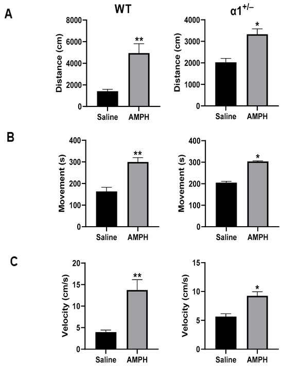 Effects of AMPH treatment (i.p.) on behavior in OFT in wt and α1+/− mice. The two strains of mice received AMPH (5 mg/kg, i.p., n = 8). The mice were placed in an open field within 15 min after treatment, and their behavior was monitored. Three parameters were tested: distance moved (cm) (A), duration of mobility (s) (B), and mean velocity (cm/s) (C) during a 6-min session. An unpaired two-tailed T-test was performed. Values are expressed as mean ± SE (error bars). * p < 0.05, vs. respective control, ** p < 0.001 vs. respective control.
