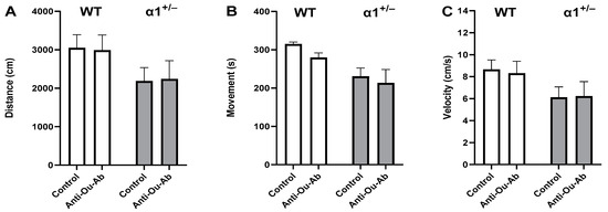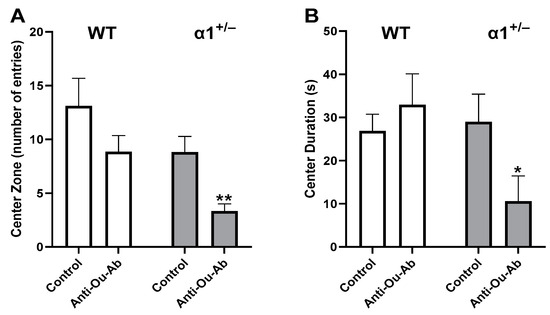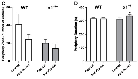 To explore the involvement of ECS in behavior, we used OFT to test the behavioral effect of administration of anti-Ou-Ab into the brains of amphetamine (AMPH)-treated wt and α1+/− mice. OFT is a simple sensorimotor test used to determine general activity levels, gross locomotor activity, and exploration habits in rodent models of CNS disorders. The motor activities (distance moved, duration, and velocity of movement) are considered parameters of depression- or mania-like behaviors, and the number of entries and time spent in the center or periphery are indicators of anxiety and exploration behaviors, respectively [31,32].