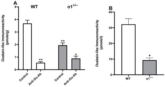 Effects of anti-Ou-Ab administration on ECS (measured as ouabain-like immunoreactivity) levels in the brains and serum of wt and α1+/− mice. Wt and α1+/− mice were sacrificed immediately after the FST (Figure 1). The brain cortex was excised and extracted, and ECS levels were determined with enzyme-linked immunosorbent assays (Section 4) (A). Serum samples were collected from the mice and ECS were extracted and determined (B). Differences in steroid levels were analyzed with a multiple comparisons two-way ANOVA. Values are expressed as mean ± SE (error bars). * p < 0.05 vs. respective control, ** p < 0.005 vs. respective controls.