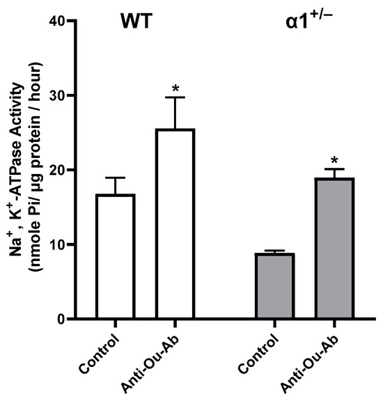 Effects of anti-Ou-Ab administration on Na+, K+-ATPase activity in the brains of wt and α1+/− mice. Wt and α1+/− mice were sacrificed immediately after the FST experiments (Figure 1). Mouse brain cortex was excised and used for the preparation of plasma membrane synaptosomal fraction (Section 4). Na+, K+-ATPase activity in the synaptosomal fraction was determined as previously described (Section 4). Na+, K+-ATPase activity, expressed in nmol Pi/µg protein/h, represented more than 80% of the total ATPase activity in the preparation. Differences in enzymatic activity were analyzed with a multiple comparisons two-way ANOVA. Values are expressed as mean ± SE (error bars). * p < 0.05 vs. respective controls.