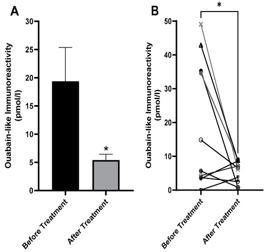 Effects of treatment on the levels of ECS (measured as ouabain-like immunoreactivity) in the serum of bipolar patients. Blood samples were collected from ten patients immediately after admission to the acute psychiatric unit of the Eitanim Psychiatric Hospital because of a manic psychotic episode. A second blood sample was collected 2–3 weeks later, after the patients had stabilized. The serum was extracted, and the levels of ECS were determined (Section 4). The average ECS levels before and after treatment are depicted in (A). The change in ECS in each patient is shown in (B). The differences in steroid levels before and after treatment were analyzed with nonparametric paired t tests (Wilcoxon). Values are expressed as mean ± SE (error bars). * p <0.05 vs. after treatment.