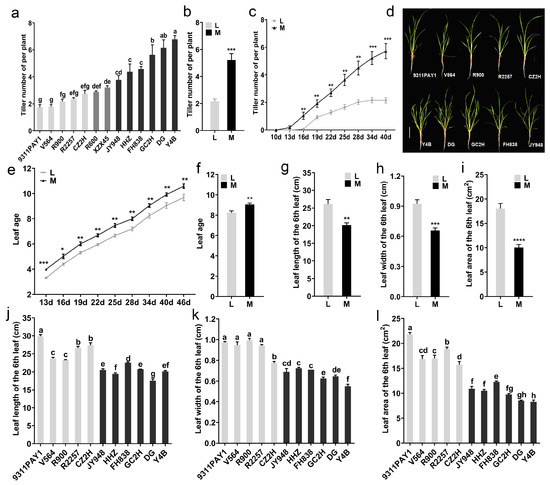Rice tillering and related phenotypic traits. (a) The tiller number of per plant of the 13 rice varieties at 34 days after sowing (n = 3, each replication contained 10 plants). (b) The average values of tiller number per plant of the two rice groups at 34 days after sowing. (c) Dynamic changes of the tiller number per plant of the two rice groups. (d) Plant morphology of each variety at 28 days after sowing. Bar = 10 cm. (e) Dynamic changes of leaf age of the two rice groups. (f) The average values of leaf age of the two rice groups at 34 days after sowing. (g–i) The average values of leaf length (g), leaf width (h) and leaf area (i) of the 6th leaf of the two rice groups. (j–l) The length (j), width (k) and leaf area (l) of the 6th leaf of the 11 rice varieties (n = 3, each replication contained 10 plants). Note: L: Low-tillering group, M: Multi-tillering group. The values are mean ± SE. The significance of the difference between the low-tillering group and the multi-tillering group was determined using Student’s t-test (* p < 0.05, ** p < 0.01, *** p < 0.001, **** p < 0.0001). The different lowercase letters in (a,j–l) indicate significant differences according to LSD (least significant difference) tests (p < 0.05).