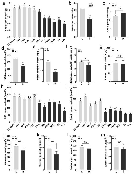 Aboveground biomass at 28 days after sowing and the non-structural carbohydrate (NSC) content of leaves and sheaths at 6-leaf stage. (a) The single-culm biomass of the 11 rice varieties at 28 days after sowing (n = 3, each replication contained 10 plants). (b,c) The average values of single-culm biomass (b) and above-ground biomass (c) of the two rice groups at 28 days after sowing. (d–g) The average contents of NSC (d), starch (e), soluble sugar (f) and sucrose (g) in sheaths of the two rice groups. (h,i) The contents of NSC (h) and starch (i) in sheaths of the 11 rice varieties (n = 3, each replication contained 10 plants). (j–m) The average contents of NSC (j), starch (k), soluble sugar (l) and sucrose (m) in the leaves of the two rice groups. Note: L: Five low-tillering rice varieties, M: Six multi-tillering rice varieties. Note: L: Low-tillering group; M: Multi-tillering group. Values are mean ± SE. The significance of the difference between low-tillering group and multi-tillering group was determined using Student’s t-test (** p < 0.01, *** p < 0.001, “ns” represents no significant difference). The different lowercase letters in (a,h,i) indicate significant differences based on the LSD (least significant difference) test (p < 0.05).