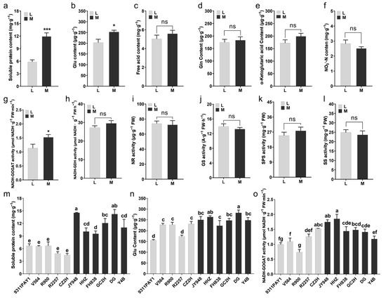 The contents of nitrogen metabolites and the activities of carbon and nitrogen metabolism-related enzymes in rice leaves at tillering stage. (a–f) The average values of soluble protein content (a), Glu content (b), free acid content (c), Gln content (d), α-Ketoglutaric acid content (e) and NO3−-N content in leaves of the two rice groups. (g–l) The average values of NADH-GOGAT activity (g), NADH-GDH activity (h), NR activity (i), GS activity (j), SPS activity (k) and SS activity (l) in leaves of the two rice groups. (m,n) The contents of soluble protein (m) and Glu (n) of the 11 rice lines (n = 3). (o) The activities of NADH-GOGAT in leaves of 11 rice lines (n = 3). Note: L: Low-tillering group, M: Multi-tillering group. Values are mean ± SE. The significance of the difference between low-tillering group and multi-tillering group was determined using Student’s t-test (* p < 0.05, *** p < 0.001, “ns” represents no significant difference). The different lowercase letters in (m–o) indicate significant differences according to LSD (least significant difference) tests (p < 0.05).