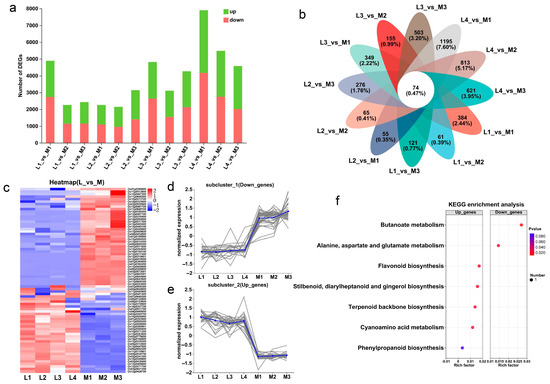 Then, the DEGs (differentially expressed genes) of the two groups of rice varieties were identified according to the criteria of |log2Fold Change| ≥ 1 and p-adjust < 0.05. The results showed that the DEGs of L2_vs_M2 were the least, with 2148 DEGs (1198 up-regulated genes and 950 down-regulated genes), and the DEGs of L4_vs_M1 were the most, with 7902 DEGs (3737 up-regulated genes and 4165 down-regulated genes) (Figure 4a). Further analysis of the DEGs shared by each low-tillering rice variety and the three multi-tillering rice varieties showed that the number of common DEGs in L1_vs_M, L2_vs_M, L3_vs_M and L4_vs_M was 615, 669, 1176 and 1442, respectively (Figure S3a,d). In summary, the results showed that there was a large difference in the transcriptome level between the two groups of rice varieties, and there was also a large difference in the transcriptome level between the four low-tillering varieties.
