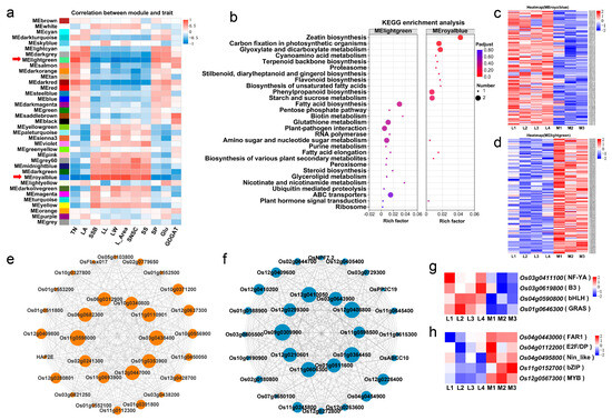 Weighted gene co-expression network analysis (WGCNA) of gene expression and the related traits. (a) Matrix of correlation between module and traits. TN: Tiller number per plant, LA: Leaf age, SSB: Single-stem biomass, LL: Leaf length, LW: Leaf width, L_Area: Leaf area, SNSC: Sheath NSC content, SS: Sheath starch content, SP: Soluble protein content in leaves, Glu: Glutamate content in leaves, GOGAT: Glutamate synthase activity in leaves. (b) KEGG functional enrichment analysis of MElightgreen and MEroyalblue module genes. (c,d) The gene expression profile heat map of the MEroyalblue module genes (c) and MElightgreen module genes (d). (e,f) The co-expressed gene network of the top 30 connectivity in the MEroyalblue module (e) and MElightgreen module (f). The size of the circle in the co-expression network diagram represents the connectivity of the gene. (g,h) The gene expression profile heat map of the transcription factors in MEroyalblue module (g) and MElightgreen (h) module genes.