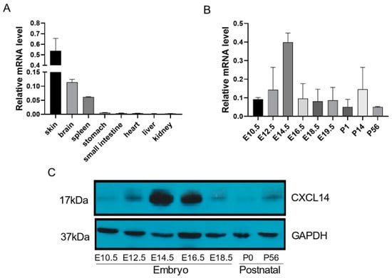 The CXCL14 expression of mice in spatial and temporal. (All data are expressed as mean ± SD, n = 3). (A) The expression of CXCL14 in major organs of adult male and female 8-week-old mice by Q-PCR, which was higher in the skin and brain than in other organs. (B) The expression of CXCL14 by Q-PCR at embryonic days 10.5, 12.5, 14.5, 16.5, 18.5, 19.5 and postnatal days 1, 14, 56. (C) The expression of CXCL14 by Western Blot at embryonic days 10.5, 12.5, 14.5, 16.5 18.5 and postnatal days 0, 56.