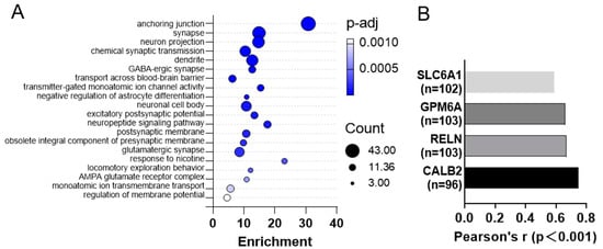 The top 1000 genes that have the most similar expression pattern to CXCL14 in cerebral cortex were mined by the “Similar Genes Detection” function in the GEPIA website from cerebral cortex dataset of GTEx database. The genes were ranked by Pearson’s correlation coefficient (PCC). These genes were enriched in the anchoring junction, synapse, neuron projection, chemical synaptic transmission, and dendrite-related pathways (Figure 3A). The key genes related to neuron projection and dendrite, SLC6A1, GPM6A, RELN, CALB showed strong correlations with CXCL14 (Figure 3B, p < 0.001).