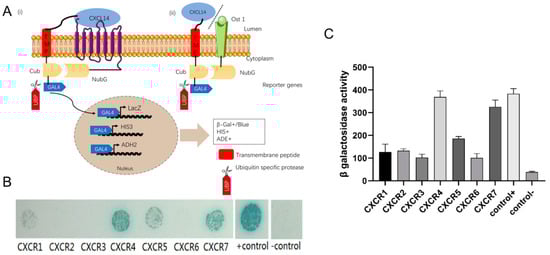 Interaction test of the CXCL14 and CXCR family members. (A) Diagram of Membrane-Anchored Ligand and Receptor Yeast Two-Hybrid, MALAR-Y2H. (i) The interaction between CXCL14 and the CXCR series receptor protein was detected. CXCL14 was fused to the C-terminus of ubiquitin protein (Cub) through a transmembrane peptide (TMP) and conjugated to the transcription factor GAL4. The C-terminus of the receptor protein is coupled to the N-terminus of the ubiquitin protein (Nub). When CXCL14 interacts with the extracellular domain of the receptor, Cub and Nub recombine into active ubiquitin monomers that are hydrolyzed by ubiquitin-specific hydrolase (UBP) to release GAL4. (ii) Negative control, CXCL14 and yeast membrane protein OST1 were used as bait and prey to form a negative control group. (B) Yeast Two-hybrid. GoldY2H cells expressing the CXCL14-CXCL14-TMP-Cub-GAL4 plasmid were hybridized with Y187 cells expressing each OST1-CXCR-NubG fusion protein, and diploid cells were dropped onto SD/Leu−Trp−Ade−His− plates containing α-X-gal and 15 mM 3-AT. The growth of cells was observed after 72 h cultivation. CXCL14-TMP-Cub-GAL4 × OST1-NubG was used as a negative control and WBP1-Cub-GAL4 × OST1-NubG was used as a positive control. (C) β-Gal assay of diploid cells expressing SP-CXCL14-TMP-Cub-GAL4 and each of the SP-OST1-CXCR-NubG proteins. The experiment was repeated three times independently and every sample was tested twice in each experiment (n = 3).
