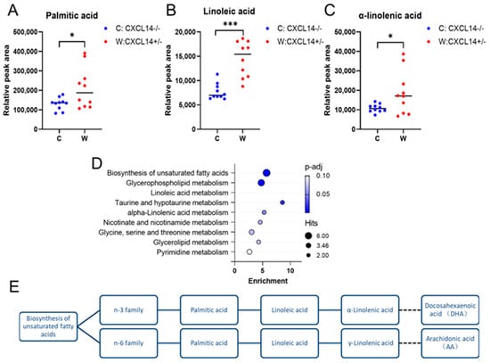 Summary diagram of Met-PA pathway analysis (all data are expressed as mean SD). (A) The relative peak area abundance of palmitic acid in CXCL14−/− 8-week-old mice was significantly lower than that in CXCL14+/− 8-week-old mice. (n = 10, *: p < 0.05). (B) The relative peak area abundance of linoleic acid in CXCL14−/− 8-week-old mice was significantly lower than that in CXCL14+/− 8-week-old mice. (n = 10, ***: p < 0.001). (C) The relative peak area abundance of α-linolenic acid in CXCL14−/− 8-week-old mice was significantly lower than that in CXCL14+/− 8-week-old mice. (n = 10, *: p < 0.05). (D) Pathway analysis of differential metabolites for plasma between CXCL14+/− (W) and CXCL14−/− (C) mice by LC-MS metabolomics. (E) Differential metabolites in the biosynthetic pathway of unsaturated fatty acid.