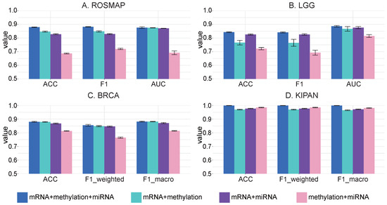 In our investigation, we performed analysis using four public benchmark datasets, including ROSMAP for binary classification (distinguishing between Alzheimer’s disease (AD) and a normal control (NC)), BRCA for the classification of breast-invasive carcinoma into PAM50 subtypes (including five categories), low-grade glioma (LGG) for distinguishing between grade and grade , and KIPAN, referring to the classification of renal cell carcinoma subtypes. All datasets were acquired from Wang et al. [19], and they each contained three types of omics data: mRNA expression, DNA methylation, and miRNA expression. Detailed information regarding data acquisition and preprocessing was available in [19]. In brief, features with no signal () and those with low variances ( for mRNA, for DNA methylation, and 0 for miRNA) were filtered out. To optimize the feature selection, the ANOVA F-value and principal component analysis (PCA) were employed. Initially, ANOVA tests were utilized to preselect features, reducing the impact of redundant ones. Subsequently, PCA was applied to the preselected features, aiming for the first principal component to account for less than 50% of the variance, thereby avoiding the overrepresentation of any individual feature within the dataset. Each feature was then scaled to the range of [0,1] through a linear transformation. Comprehensive details regarding these datasets are presented in Table 5.