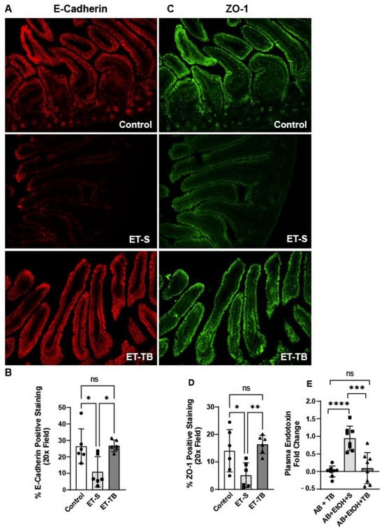 Ethanol exposure is known to alter the epithelial barrier of the proximal colon []. Here, we tested the effects of acute ethanol exposure on the epithelial barrier of the small intestine. Acute ethanol exposure caused disruption in tight junctional (TJ) protein (zonulen occluden-1 (ZO-1), E-Cadherin) localization in the jejunum of mice (Figure 2A–D), as demonstrated by immunohistochemistry (IHC). However, tributyrin supplementation maintained immune-reactive positive staining intensity of TJ similar to patterns seen in control mice (Figure 2B,D). Overgrowth of intestinal Gram-negative bacteria can disrupt intestinal barrier integrity and lead to increased endotoxin into systemic circulation []. Therefore, we tested plasma endotoxin levels amongst the treatment groups as a functional marker of an impaired intestinal barrier. As predicted, plasma endotoxin levels were induced in mice exposed to antibiotic and ethanol, while mice supplemented with tributyrin were protected against endotoxemia (Figure 2E).