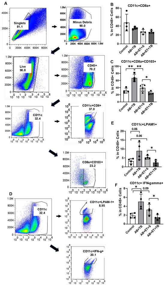 Single cells harvested from the small intestinal lamina propria of mice were stained for surface receptors and analyzed by flow cytometry for expression of CD11c+CD8a+, and CD11c+CD8a+CD103+, CD11c+LPAM1+, and CD11c+IFN-gamma+ (Figure 4A,D). There were no differences in the CD11c+CD8a+ cells between the groups (Figure 4B). However, antibiotic exposure increased CD11c+CD8a+CD103+ positive cells in mice, which was diminished by ethanol exposure, and tributyrin supplementation during ethanol exposure further reduced CD11c+CD8a+CD103+ positive cells (Figure 4C). Additionally, tributyrin supplementation in ethanol exposed mice resulted in lower CD11c+LPAM1+ and CD11c+IFN-gamma+ positive cells compared to mice only treated with antibiotic/tributyrin or antibiotic/ethanol (Figure 4E,F). These data suggest that tributyrin supplementation maintained a tolerogenic DC response during ethanol exposure by protecting against an impaired jejunal epithelial barrier, endotoxin translocation, and MAdCAM-1 activation.