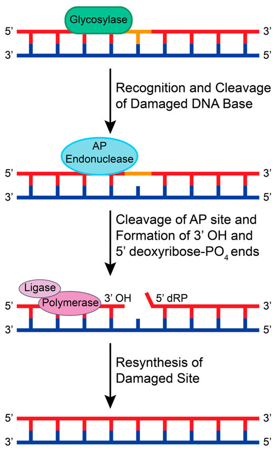 The BER pathway is initiated by DNA glycosylases that search for lesions by 3D diffusion or by sliding along the DNA backbone via ionic interactions between the negatively charged phosphodiester backbone and positively charged amino acids in the glycosylase [39]. When a lesion is recognized, the glycosylase stops and cleaves the glycosidic bond between the damaged base and sugar, creating an AP site [40]. If the glycosylase recruited is monofunctional, an AP endonuclease then recognizes and cleaves the AP site to create 3′ OH and 5′ deoxyribose-PO4 ends [41]. If the glycosylase is bifunctional, the glycosylase will cleave the AP site and promote the recruitment of end processing enzymes. This allows for DNA polymerase and DNA ligase to insert the correct base pair and ligate the 3′ and 5′ ends, respectively (Figure 2).
