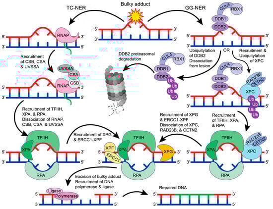 The GG-NER and TC-NER pathways. In TC-NER (left), RNA polymerase (RNAP) stalls at the lesion to recruit CSB, CSA, and UVSSA, which recruits TFIIH, XPA, and RPA. Upon TFIIH, XPA, and RPA binding, the RNAP complex dissociates from the DNA. In GG-NER, the lesion is recognized by the DDB2-DDB1-CUL4-RBX1 E3 ubiquitin ligase complex that will either ubiquitylate DDB2 for proteasomal degradation or recruit XPC-RAD23B-CETN2. Ubiquitylation of XPC leads to the recruitment of TFIIH, XPA, and RPA. In both TC-NER and GG-NER, TFIIH, XPA, and RPA create a bubble in the double helix to allow for the recruitment of XPG and ERCC1-XPF. In GG-NER, when XPG and ERCC1-XPF are recruited, the XPC-RAD23B-CETN2 complex dissociates from the DNA. XPG and ERCC1-XPF excise the bulky DNA lesion, which can then be repaired by DNA polymerase and DNA ligase. The figure was made in Adobe Illustrator with the proteasome supplemented from BioRender.com (accessed on 9 October 2023).