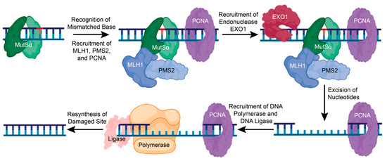 The mismatch repair pathway corrects a single nucleotide error. In MMR, a single mismatched, inserted, or deleted nucleotide is recognized by the sliding clamp complex, MutSα. This promotes the recruitment of MLH1, PMS2, and PCNA, which then recruits the endonuclease, EXO1. EXO1 removes the damaged base pair and other nucleotides to recruit DNA polymerase and DNA ligase to resynthesize and repair the damaged DNA. Figure created with BioRender.com (accessed on 16 January 2024).