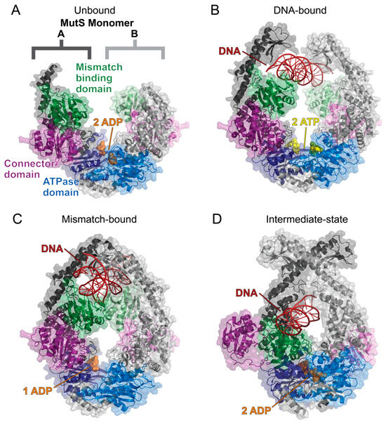 - Borsellini, A.; Kunetsky, V.; Friedhoff, P.; Lamers, M.H. Cryogenic electron microscopy structures reveal how ATP and DNA binding in MutS coordinates sequential steps of DNA mismatch repair. Nat. Struct. Mol. Biol. 2022, 29, 59–66. [Google Scholar] [CrossRef] [PubMed]