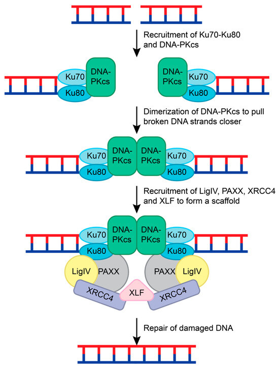 NHEJ is the most common repair pathway for mutagenic DSBs and requires the coordination of many different proteins. NHEJ repair is initiated when two Ku70-Ku80 ring-shaped heterodimers bind adjacent to the DSB on each strand [107] (Figure 7). Ku serves as a loading protein to recruit other NHEJ proteins to the site of DNA. DNA-dependent protein kinase catalytic subunit (DNA-PKcs), a phosphatidylinositol 3-kinase-related kinase (PIKK) family member, is then recruited to the Ku70-Ku80 complex. Upon binding to DNA and the Ku70-Ku-80 complex, DNA-PKcs interacts with another DNA-PKcs complex on the other DNA strand. This interaction pulls the broken strands closer together by pushing the Ku70-Ku80 dimers further from the DSB, activating the DNA-PKcs serine/threonine kinase activity [108,109,110] (Figure 7). DNA-PKcs phosphorylates various NHEJ proteins during this process, including Ku70 (at S6), Ku80 (at S577, S580, and T715), itself, X-ray repair cross-complementing protein 4 (XRCC4; at S320), and Artemis (at S516 and S645) [14,111,112,113,114,115].