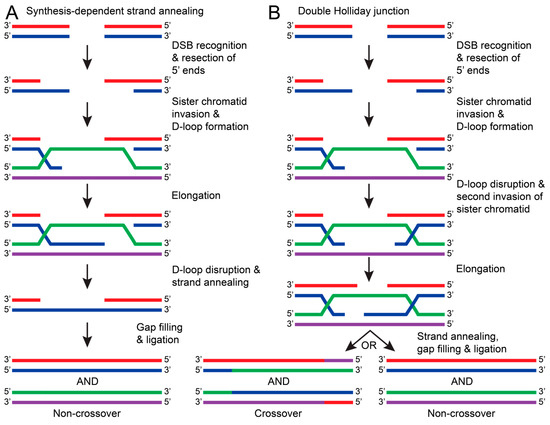 The general pathways of DNA repair via HR. In both pathways, HR is initiated by recognizing DSBs and resecting the 5′ ends of the damaged DNA strand (red with blue). The overhanging 3′ end of the damaged DNA (blue) invades the sister chromatid (green with purple) to form a D-loop. (A) In synthesis-dependent strand annealing (SDSA), the damaged DNA strand (blue) is elongated using a sister chromatid DNA strand as a template (purple). The D-loop is disrupted, causing the damaged DNA strands to anneal (red with blue). DNA polymerase and ligases fill in nucleotide gaps and ligate the stand to result in a non-crossover repair (red with blue and green with purple). (B) If the D-loop is disrupted by a second invasion of the damaged strand (blue), then a double Holliday junction is formed. Both damaged DNA strands (red and blue) are elongated, but when the junction resolves, both crossover (red/purple with blue/green and green/blue with purple/red) and non-crossover products can occur.