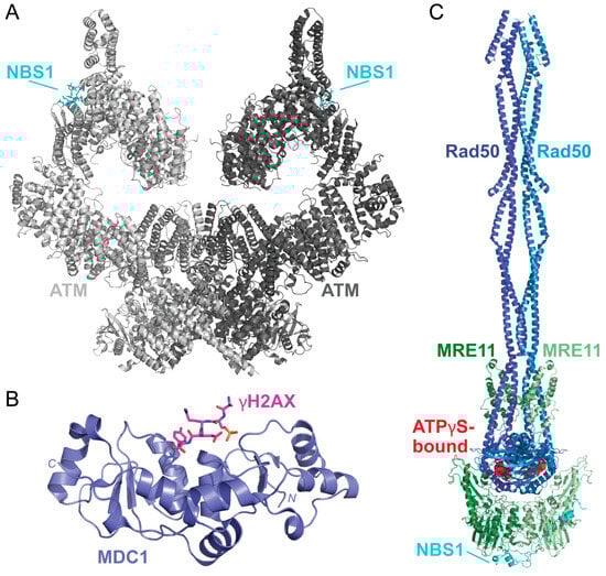 The solved structures of DSB response proteins ATM, MDC1, and MRN. (A) The structure of the ATM (shades of gray) bound to NBS1 (cyan) solved via cryo-EM shows that there are two possible NBS1-binding sites on the ATM dimer (PDB 7SID) [134]. Each ATM monomer is shown in a different shade of gray. (B) The structure of the BRCT domain of MDC1 (purple) bound to a γH2AX phosphopeptide (pink) was solved using X-ray crystallography (PDB 2AZM) [137]. The γH2AX peptide contains the C-terminal residues 134–143 and a phosphoserine at residue S140 (KKATQA-pS-QEY). (C) The solved structures of the MRN complex from Chaetomium thermophilum are bound to ATPγS (red spheres). This structure shows how MRE11 (shades of green) and Rad50 (shades of blue) form a dimer that is scaffolded together by NBS1 (cyan). This complex was solved using cryo-EM (PDB 7ZR1) [140]. Structures were visualized using PyMOL [52].