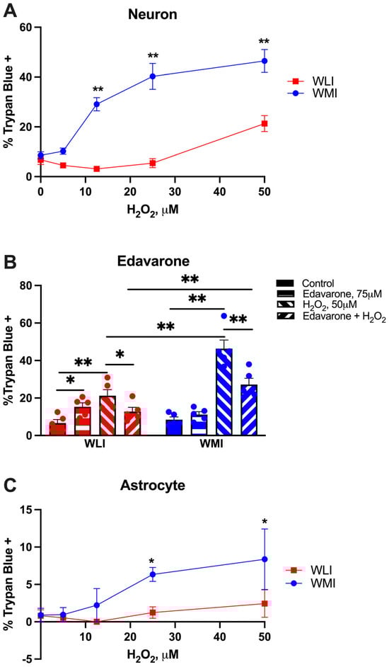 WMI hippocampal neurons and cortical astrocytes respond to increasing doses of H2O2 with significantly more cell death compared to WLI neurons and astrocytes. (A) The percentage of neurons with trypan blue inclusion [dead cells] was significantly higher in WMI neuronal cultures exposed to 12.5, 25 and 50 μM H2O2 than those of the WLI neurons. (B) Neuronal death induced by 50 μM H2O2 was reversable via the administration of 75 μM edavarone in both strains. (C) WMI cortical astrocytes showed a greater percentage of dead [trypan blue +] cells than WLIs at H2O2 doses of 25 and 50 μM. Values are mean +/− SEM from n = 5/strain/dose of H2O2 or other treatments. * p < 0.05, ** p < 0.01: comparison between WMI and WLI at the same dose of H2O2 for (A,C). Comparisons are as marked in (B).