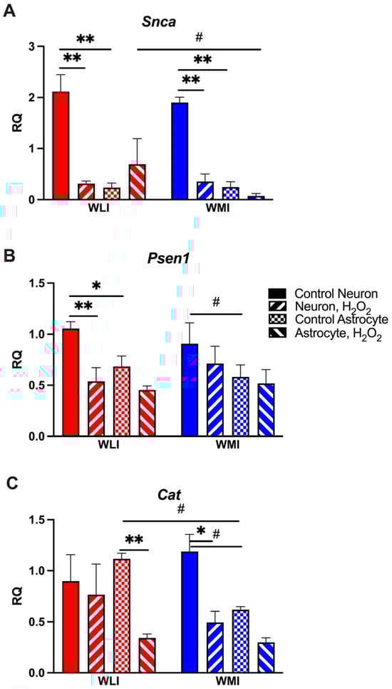 Neuronal gene expression differences between WLI and WMI in response to 50 μM of H2O2. (A) Synuclein alpha (Snca) expression is significantly greater in neurons than in astrocytes, and this neuronal expression is decreased in response to H2O2. (B) Presenilin 1 (Psen1) expression is also significantly greater in neurons than in astrocytes, particularly in WLIs, and it is reduced by H2O2 in WLI, but not in WMI neurons. (C) Catalase (Cat) expression is reduced by H2O2 in WMI neurons only, while only WLI astrocytes respond with significantly reduced transcript levels to the same treatment. Note that WMI astrocytes tend to express less Cat than WLIs. Values are mean +/− SEM from n = 3–4/strain/cell type/treatment. * p < 0.05, ** p < 0.01, # p < 0.1; comparisons are as marked.