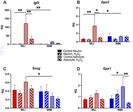 Igf2, Gpx2 and Sncg expressions were significantly greater in WLI cortical astrocytes compared to WMIs’ (Figure 3). Subsequently, H2O2 treatment only reduced Igf2 and Gpx2 transcript levels in WLI astrocytes (Igf2: strain, F[1,17] = 6.75, p = 0.019; cell type, F[1,17] = 10.48, p = 0.005; H2O2, F[1,17] = 3.73, p = 0.070; strain × cell type, F[1,17] = 6.60, p = 0.020; cell type × H2O2, F[1,17] = 3.76, p = 0.069; Figure 3A; Gpx2: cell type, F[1,15] = 4.81, p = 0.045; H2O2, F[1,15] = 3.99, p = 0.064; Figure 3B). Sncg expression differed between WLI and WMI astrocytes without any treatment (strain, F[1,17] = 3.88, p = 0.066; strain × cell type, F[1,17] = 4.23, p = 0.055; Figure 3C).