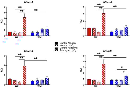 Transcript levels of mitochondrial genes significantly increased in response to 50 μM H2O2 only in WLI cortical astrocytes. Expression of all four mitochondrial genes increased after treatment with H2O2 in WLI astrocytes, but not in WLI and WMI neurons and WMI astrocytes. The WMI Mt-nd3 expression tended to follow the WLI pattern. Values are mean +/− SEM from n = 3–4/strain/cell type/treatment. ** p < 0.01, # p < 0.1, comparisons are as marked.