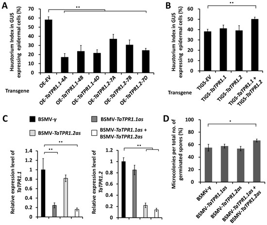 These TaTPR1.1-4A, TaTPR1.1-4B, TaTPR1.1-4D, TaTPR1.2-7A, TaTPR1.2-7B, or TaTPR1.2-7D genes were overexpressed in the leaf epidermal cells of the powdery mildew-susceptible wheat cultivar Yannong 999 using transient gene expression assays. After the inoculation of conidia from the virulent B.g. tritici isolate E09, the formation of B.g. tritici haustoria was statistically analyzed to evaluate the wheat post-penetration susceptibility to powdery mildew. As shown in Figure 3A, the B.g. tritici haustorium index (HI%) decreased from 58% for the empty vector (OE-EV) control to below 37% on wheat cells overexpressing TaTPR1.1 or TaTPR1.2 genes. These results suggested that the overexpression of TaTPR1 could enhance the formation of Bgt haustoria and attenuate the wheat post-penetration susceptibility to the fungal pathogen B.g. tritici.
