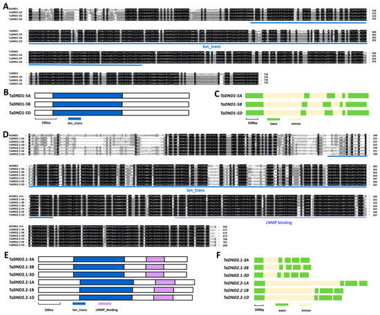 As shown in Figure 4A, these predicted TaDND1-5A, TaDND1-5B, and TaDND1-5D proteins shared about 67% of their identities with Arabidopsis AtDND1. The TaDND1-5A, TaDND1-5B, and TaDND1-5D proteins all contain an ion transport (Ion_trans) domain (Figure 4B). The coding regions of these allelic TaDND1 genomic sequences all contain five exons and four introns (Figure 4D). As shown in Figure 4E, these predicted TaDND2.1-3A, TaDND2.1-3B, TaDND2.1-3D, TaDND2.2-1A, TaDND2.2-1A, and TaDND2.2-1D proteins shared over 59% of their identities with Arabidopsis AtDND2. The TaDND2.1-3A, TaDND2.1-3B, TaDND2.1-3D, TaDND2.2-1A, TaDND2.2-1A, and TaDND2.2-1D proteins all contain an Ion_trans domain and a cyclic nucleotide-binding (cNMP binding) domain (Figure 4F). The coding regions of these allelic TaDND2.1 genomic sequences all contain five exons and four introns, whereas the coding regions of allelic TaDND2.2 genomic sequences all contained four exons and three introns (Figure 4F).