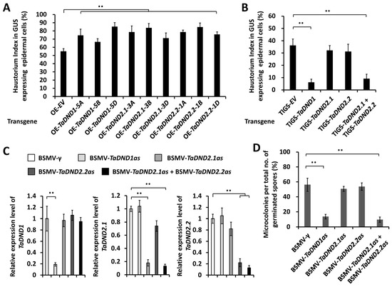 To characterize the functions of TaDND1 and TaDND2 in the regulation of the wheat–B.g. tritici interaction, we first employed transient gene expression assays to overexpress TaDND1-5A, TaDND1-5B, TaDND1-5D, TaDND2.1-3A, TaDND2.1-3B, TaDND2.1-3D, TaDND2.2-1A, TaDND2.2-1A, or TaDND2.2-1D genes in the wheat leaf epidermal cell. As shown in Figure 5A, the HI% increased from 55% for the empty vector control (OE-EV) to over 67% on wheat cells overexpressing TaDND1 or TaDND2 genes. These results suggest that the overexpression of TaDND1 or TaDND2 significantly attenuates the formation of Bgt haustoria and potentiates the wheat post-penetration susceptibility to B.g. tritici.