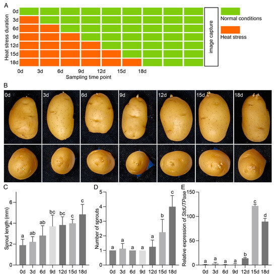 Effects of post-harvest HS on potato sprouting. (A) Schematic diagram of the post-harvest HS treatment on potatoes. (B) Phenotypes of potato sprouting at different times after the HS treatment, with the treatment details as shown in A, and photographs taken 9 days after the end of the treatment. (C) Statistics for sprout length after different durations of HS treatment. (D) Statistics for the number of sprouted buds (length > 1 mm) after various durations of HS treatment. (E) Expression profiles of StdUTPase in tuber apical bud meristem after various durations of HS treatment. Data are presented as means ± SD (n = 3). Different lowercase letters indicate significant differences (p < 0.05; analyzed using one-way ANOVA followed by Tukey’s multiple comparisons test).