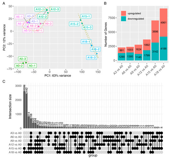 To understand the reasons behind the impact of post-harvest HS on tuber sprouting, the apical bud meristematic tissue of the tubers was sampled at three-day intervals during the HS treatment, starting before the treatment, for RNA extraction and RNA-seq-based transcriptome profiling. The PCA (principal component analysis) results showed that replicate samples from the same group clustered together, except for A3-3, which was excluded from the subsequent analyses. The clustering of the PCA results revealed that the samples could be divided into three clusters: HS treatment for 0 days, HS treatment for 3–12 days, and HS treatment for 15 and 18 days (Figure 2A).