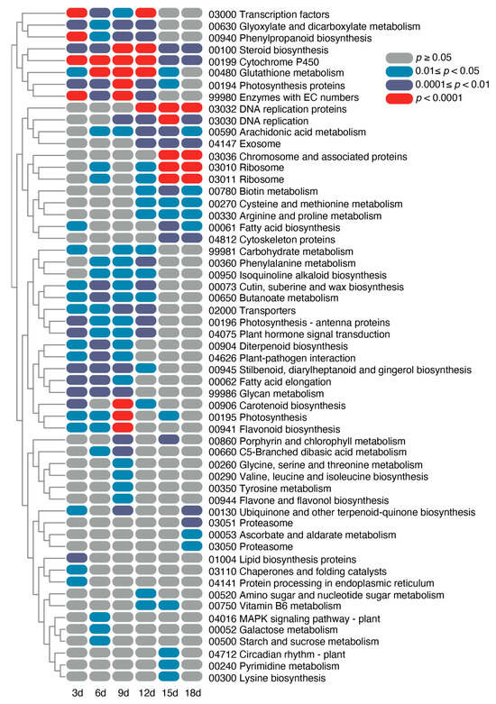 A functional enrichment analysis was conducted on these lists of DEGs, utilizing the Kyoto Encyclopedia of Genes and Genomes (KEGG) pathways to gain a deeper insight into the functions of the identified DEGs. As shown in Figure 3, the enrichment of pathways by the DEGs varied across the different HS treatment durations, with most of the KEGG pathways showing enrichment at multiple time points. Generally aligning with the PCA results, the HS treatments spanning 3–12 days and those of 15 and 18 days converged on different common pathways (Figure 3). Specifically, the pathways such as “steroid biosynthesis” and “Cytochrome P450” were enriched for all heat treatment durations, and 10 pathways, including “transcription factors”, “transporters”, and “plant hormone signal transduction”, were particularly enriched during the HS treatments spanning 3–12 days (Figure 3). Notably, the pathways involving “chromosome and associated proteins” and “cytoskeleton proteins” were distinctively enriched at the 15- and 18-day HS treatment marks (Figure 3). Considering the loss of apical dominance in the potato apical bud meristematic tissue at these stages, these two pathways might be related to this phenomenon.