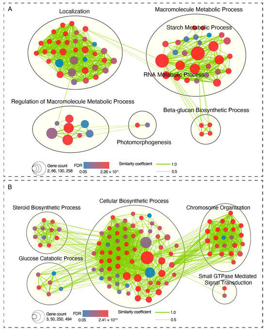 GO enrichment analysis of DEGs in Clusters 4 (A) and 6 (B). Only biological process categories are shown for this analysis. Nodes denote significantly enriched gene sets, where the fill color indicates the FDR value, the size corresponds to the gene count within the set, and the edges represent the overlapping similarity coefficient.