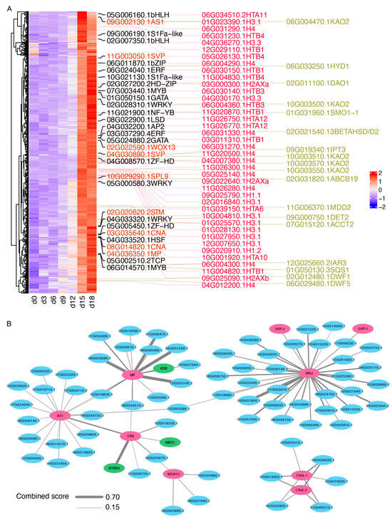 Identifying potential core regulatory genes in HS-induced sprouting variations. (A) Heatmap illustration of DEGs in Cluster 6. DEGs encoding TFs (annotated on the left; red indicates potential development-related TFs), histones (annotated in the middle in red), and enzymes (annotated on the right in gold) implicated in the steroid biosynthetic process are highlighted. (B) String protein–protein interactions (PPI) network analysis of potential core regulatory TFs within cluster 6. The potential development-related TFs are marked in red, the TFs newly identified through PPI are marked in green, and other non-transcription factor members are marked in blue. The thickness of the nodes represents the value of the combined score. The network was generated using the STRING website (https://string-db.org, accessed on 22 January 2024).