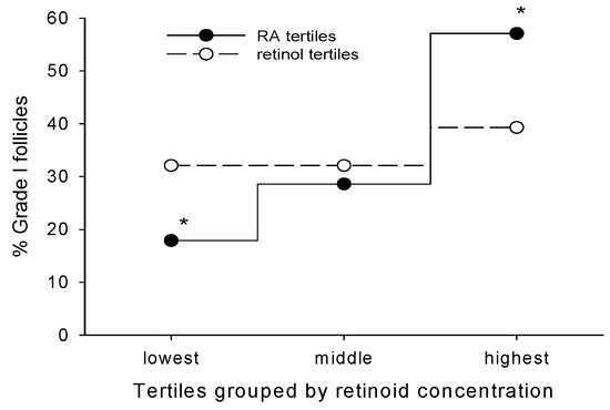 Percentage of grade I embryos derived from “mature egg follicles” (n = 84) stratified by tertiles according to RA or ROL concentrations. Percentage of grade I follicles = # of grade I follicles/28 (number of mature egg follicles in each tertile). * Significant difference between values at p < 0.005. RA concentrations in pmol/mL for each tertile (mean ± s.d.): lowest, 2.3 ± 1.2; middle, 4.8 ± 0.4; highest, 8.8 ± 3. Reproduced from Figure 3 from Pauli et al. [28].