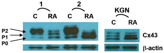 Effects of all-trans retinoic acid (RA) on Cx43 phosphorylation in cumulus granulosa cells. Total cellular protein was isolated from CGCs and the human granulosa cell line KGN and assayed for Cx43 expression by Western blotting. Representative experiments on primary CGCs from two patients and KGN cells treated with 10 µM of RA or vehicle control (C) as indicated for 48 h, with show changes in the band intensity and distribution of the non-phosphorylated (P0) and phosphorylated (P1 and P2) species of Cx43. The non-phosphorylated P0 band is the most biologically active form of Cx43 in these cells. Reproduced from. Figure 3A inset from Best et al. [21].