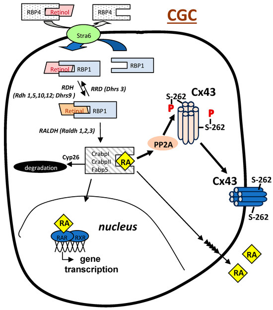 Schematic of retinoid metabolism and RA regulation of Cx43. The uptake of retinol (ROL) from circulating RBP4-bound retinol is regulated by the membrane receptor for vitamin A, Stra6. Intracellular chaperone cellular retinol-binding protein, type 1 (RBP1) physically interacts with Stra6 to pick up retinol and then delivers it to retinol dehydrogenase enzymes (RDH), which reversibly catalyze the conversion of retinol to retinal. RBP1 then chaperones retinal to retinal dehydrogenases (RALDH), which irreversibly convert retinal to RA. For the canonical/genomic regulation of various target genes, RA is then chaperoned into the cell nucleus by specific RA-binding proteins (CrabpI, CrabpII, Fabp5) to activate gene transcription. To regulate CGC gap junction activity, RA acts through a non-genomic mechanism to dephosphorylate Cx43 at the serine 262 (S-262) residue. This action is mediated through the increased interaction of Cx43 with its primary phosphatase, protein phosphatase 2A (PP2A). Once formed, RA can be (1) utilized in the RA-producing cell; (2) transported to neighboring cells (e.g., oocyte) to initiate RA-mediated signaling; and/or (3) degraded. RBP1 has been shown to be reduced in endometrial stromal cells from endometriosis patients leading to reduced RA production and Cx43 expression.