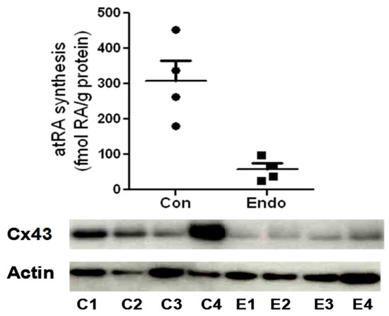 Endometriosis impacts over 8 million women in North America alone, giving rise to various symptoms, with chronic pelvic pain and infertility being the most common [52,53]. In IVF procedures, women with endometriosis ovulate fewer oocytes than healthy counterparts, and the oocytes ovulated are often compromised [54,55,56]. Consequently, the fertilization and embryo cleavage rates after IVF, in both stimulated and unstimulated cycles, are significantly lower in women with endometriosis compared to healthy controls. The fertilization and embryo cleavage rates of endometriosis oocytes remain impaired even when sperm from their partners are substituted with sperm from donors [57]. Moreover, the implantation rates of oocytes from donors with endometriosis are reduced in recipients without endometriosis [58]. It has been established that follicular fluid from women with endometriosis undergoing IVF has a notably lower mean concentration of RA than control participants [28]. In contrast, the ROL concentrations do not differ between the two groups, indicating that the impairment of RA biosynthesis in the follicle, rather than the uptake of the ROL precursor, is responsible for the reduced RA levels. This finding is consistent with earlier data showing that, in endometrial cells from endometriosis patients, the dysregulation of the retinoid metabolic pathway results in the reduced production of RA and plays a fundamental early role in the ability of the cells to implant and grow at ectopic sites [29]. In those studies, it was determined that a very early event in the ability of endometrial cells to form ectopic lesions is the reduced expression of cellular retinol-binding protein type 1 (RBP1; also known as Crbp1), a retinol chaperone protein that serves as the preferred substrate for retinol dehydrogenase enzymes in the rate-limiting step in RA biosynthesis [59] (Figure 3). Studies from our group have shown that the expression of RBP1 is important for maintaining a normal flux through the retinoid biosynthetic pathway and is reduced in ESC from endometriosis patients [29]. Consistent with the role of RA in regulating Cx43 expression, preliminary studies have suggested a direct correlation between reduced Cx43 expression in ESC from endometriosis patients and the diminished ability of the cells to synthesize RA from retinol (Figure 4). If the same relationship between RA production and Cx43 expression occurs in the CGCs from these patients, this correlation would provide a mechanistic pathway by which reduced RA levels contribute to the decreased fecundity that is associated with this disease.