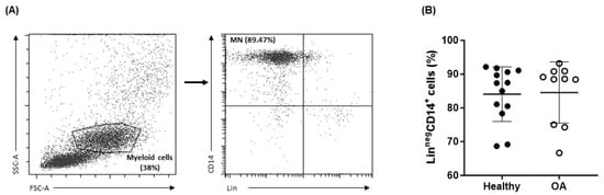 Percentage of circulating CD14+ monocytes in peripheral blood from OA patients and healthy donors. Representative dot plots of the gating strategy used for the identification of the monocyte population after doublet removal are shown in (A). Lin- (CD56, CD3, CD19, CD15) CD14+ cells were considered monocytes (MNs). Percentage of MNs found from the total myeloid cells in each of the samples is shown in (B). Data are presented as mean ± SD.