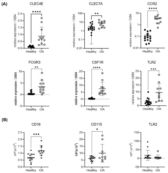 In the case of CD16, our findings demonstrated a significant increase in both the mRNA and surface expression of this marker in the monocytes from OA patients compared to those from controls. These results are consistent with previous studies in which the surface expression of CD16 was analyzed using flow cytometry in OA monocytes [30]. Moreover, studies focusing on other inflammatory diseases, such as psoriatic arthritis, have also shown higher percentages of CD16+ monocytes in patients compared to healthy subjects [34].