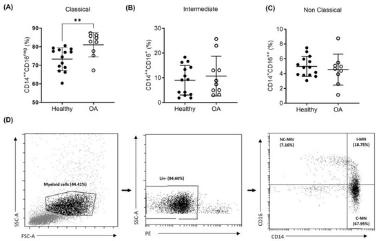 Monocyte subsets in peripheral blood from OA patients and healthy donors. Percentage of classical monocytes (CD14++/CD16−) (A); intermediate monocytes (CD14++/CD16+) (B); and non-classical monocytes (CD14+/CD16++) (C). A representative dot plot of the gating strategy for the identification of the monocyte subsets is shown in (D). n = 10–14 samples. Data are presented as mean ± SD. ** p < 0.01.