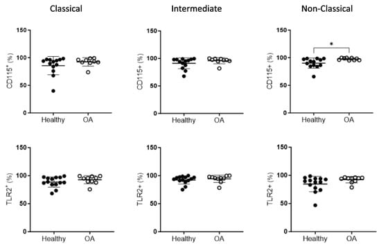 Expression of receptors CD115 and TLR2 in individual monocyte subsets. OA and healthy samples from peripheral blood were analyzed using flow cytometry. n = 9–14 samples. Data are presented as mean ± SD. * p < 0.05.