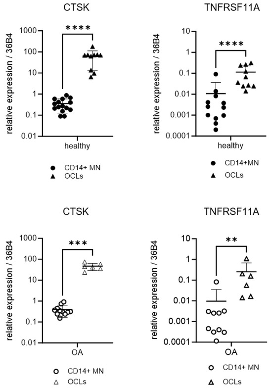 CTSK and TNRFSF11A gene expression in monocytes and OCLs of OA patients and healthy donors. CTSK = cathepsin K gene; TNRFSF11A = RANK gene. Circles represent CD14+ cells; triangles represent OCLs. n = 5–15 samples. Data are presented as mean ± SD. ** p < 0.01; *** p < 0.001; and **** p < 0.0001.