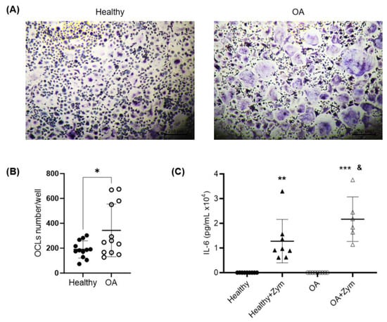 After the stimulation of the OCLs, as described in the Materials and Methods, the IL-6 production was analyzed using ELISA. IL-6 is a cytokine closely related to bone metabolism and is one of the main inflammatory cytokines that enhance inflammation in OA [46]. No differences were observed in the basal production of this cytokine by the unstimulated cells of OA patients vs. controls (19.99 ± 6.8 pg/mL vs. 20.5 ± 19.2 pg/mL; Figure 4). As expected, the cells from both healthy subjects and OA patients produced IL-6 in response to zymosan treatment. However, interestingly, the monocytes isolated from the blood samples of OA patients showed a significantly greater production of IL-6 when stimulated, compared to the stimulated monocytes from healthy donors (2.2 × 104 ± 0.9 × 104 pg/mL vs. 1.3 × 104 ± 0.9 × 104 pg/mL; p = 0.0423; Figure 6C).