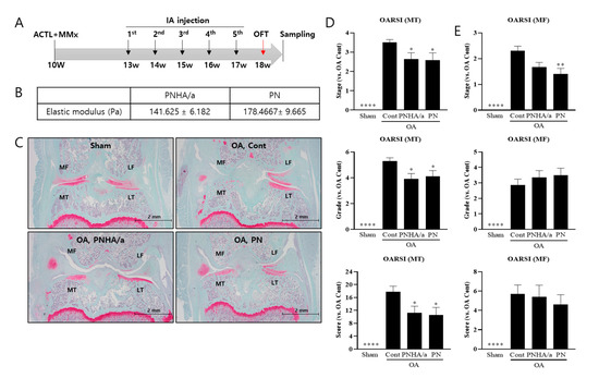 IA injection of PNHA/a delayed cartilage degeneration. (A) Experimental sched-ule for surgery and injection. (B) Elastic modulus of PNHA/a and PN. (C) Safranin O-Fast Green Staining. (D,E) OARSI score and grade in medial tibia and medial femur. N = 10–13 per group. MF, medial femur; LF, lateral femur; MT, medial tibia; LT, lateral tibia; OFT, Open field test; Sham, sham operation; OA, osteoarthritis; Cont, control vehicle; PNHA/a, polynucleotide (2%) with hyaluronic acid (0.5%); PN, polynucleotide (2%). Relative to OA control: * p < 0.05, ** p < 0.01, **** p < 0.0001 (unpaired t-test). The data are expressed as the mean ± SEM.