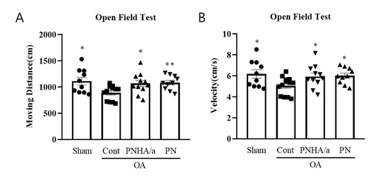 PNHA/a rescued locomotor activity in an OA rat model. (A) Moving distance of object from open field test. (B) Velocity of object from open field test. N = 10–12 per group. Sham, sham operation; OA, osteoarthritis; Cont, control vehicle; PNHA/a, polynucleotide with hyaluronic acid; PN, polynucleotide. Relative to OA control: * p < 0.05, ** p < 0.01, (unpaired t-test). The data are expressed as the mean ± SEM.